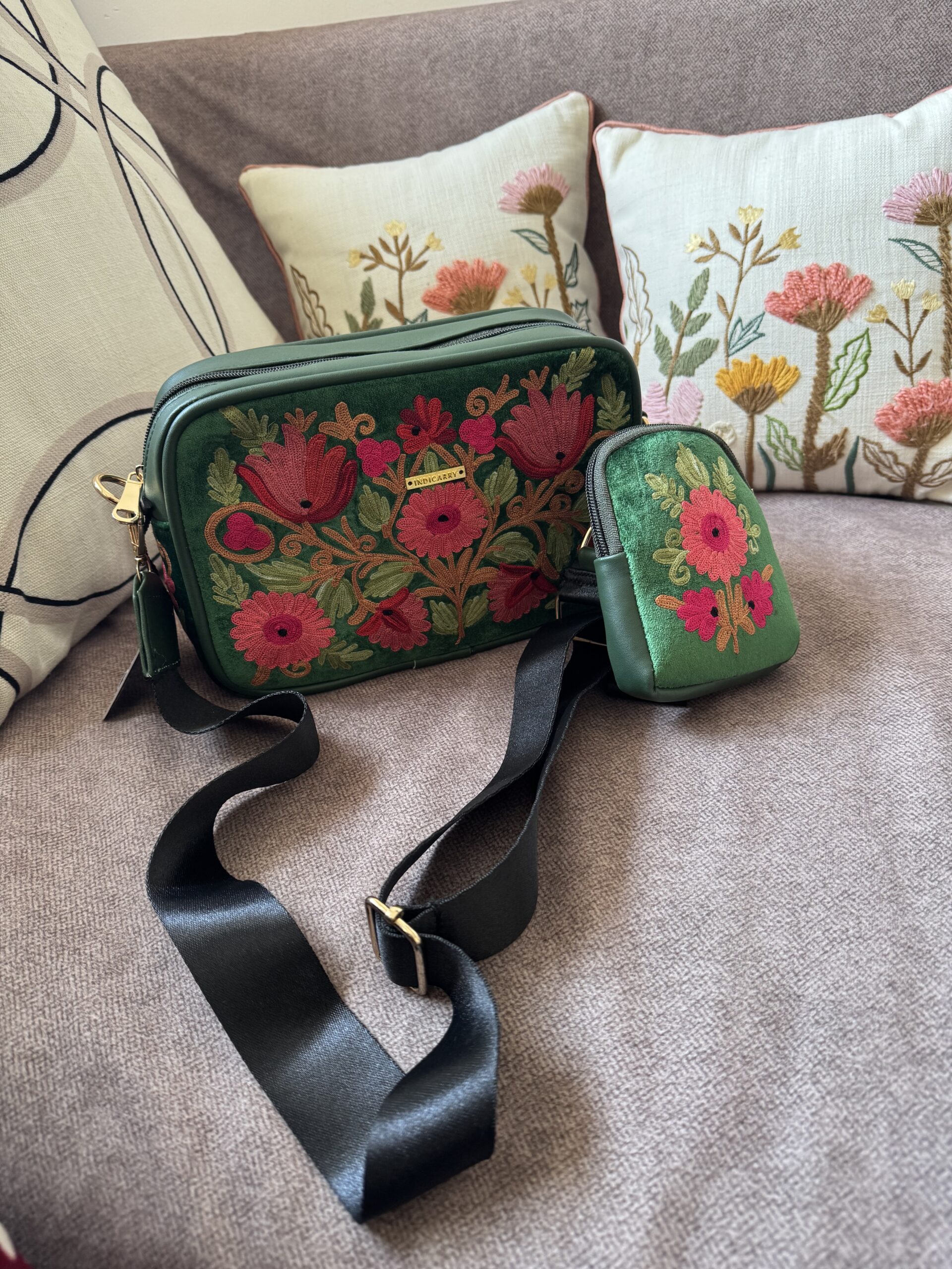Introducing our IndiDuo Sling — a perfect blend of luxury and convenience.  Aari embroidery on rich velvet, while the rest of the bag is crafted from high-quality vegan leather. The attached mini pouch adds effortless accessibility for coins, cards, or small essentials.